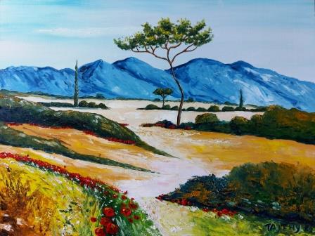 Mediterrán tájkép cédrussal, pipacsokkal, nyári hangulatban. Alkossuk meg együtt olajfestékkel szegedi festőfoglalkozásunkon!